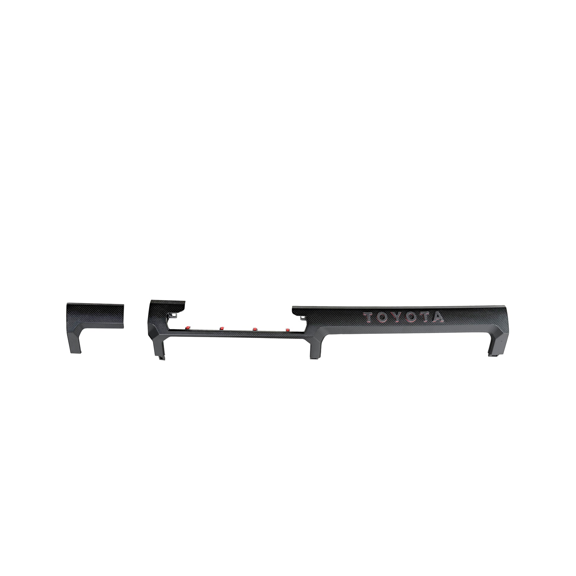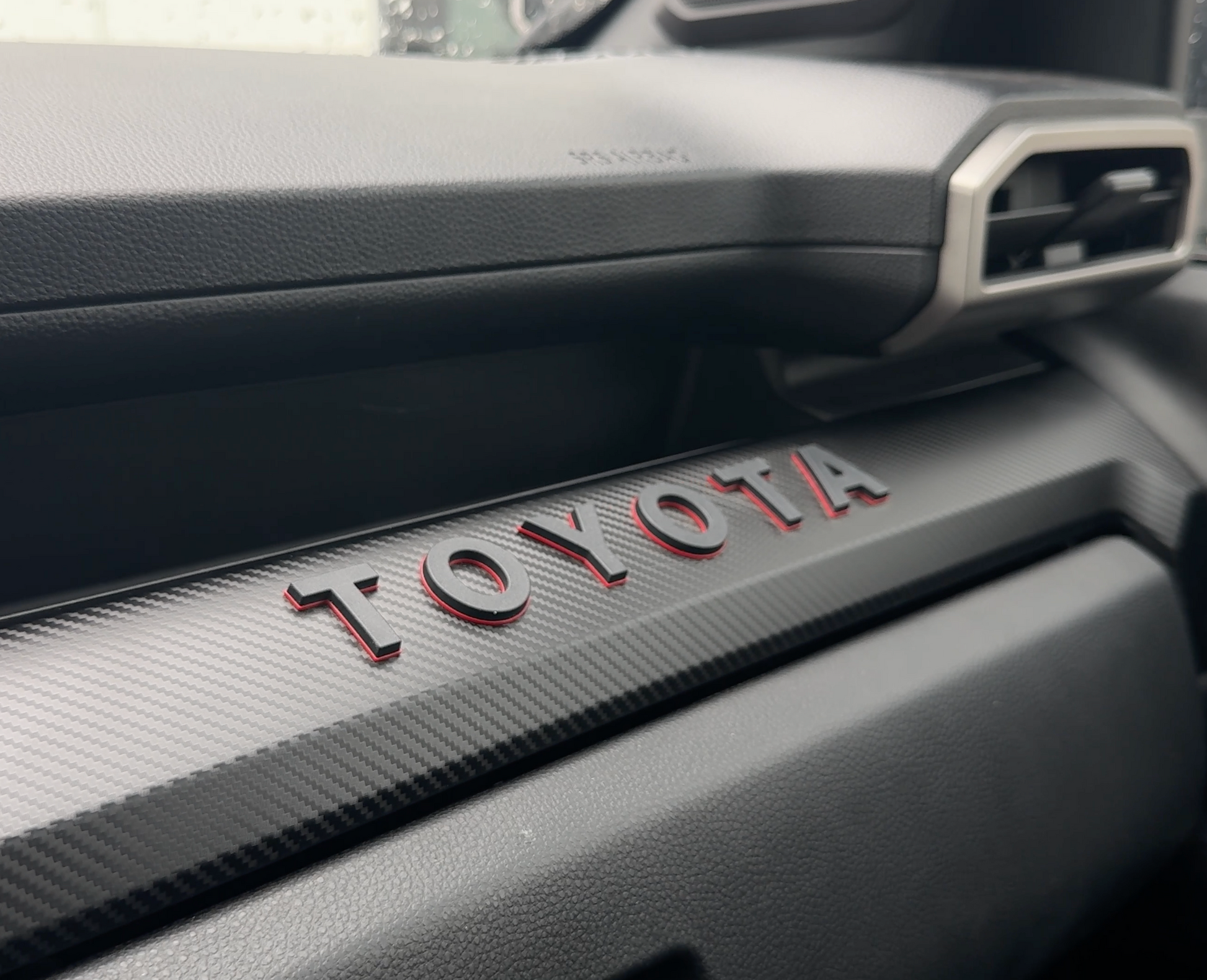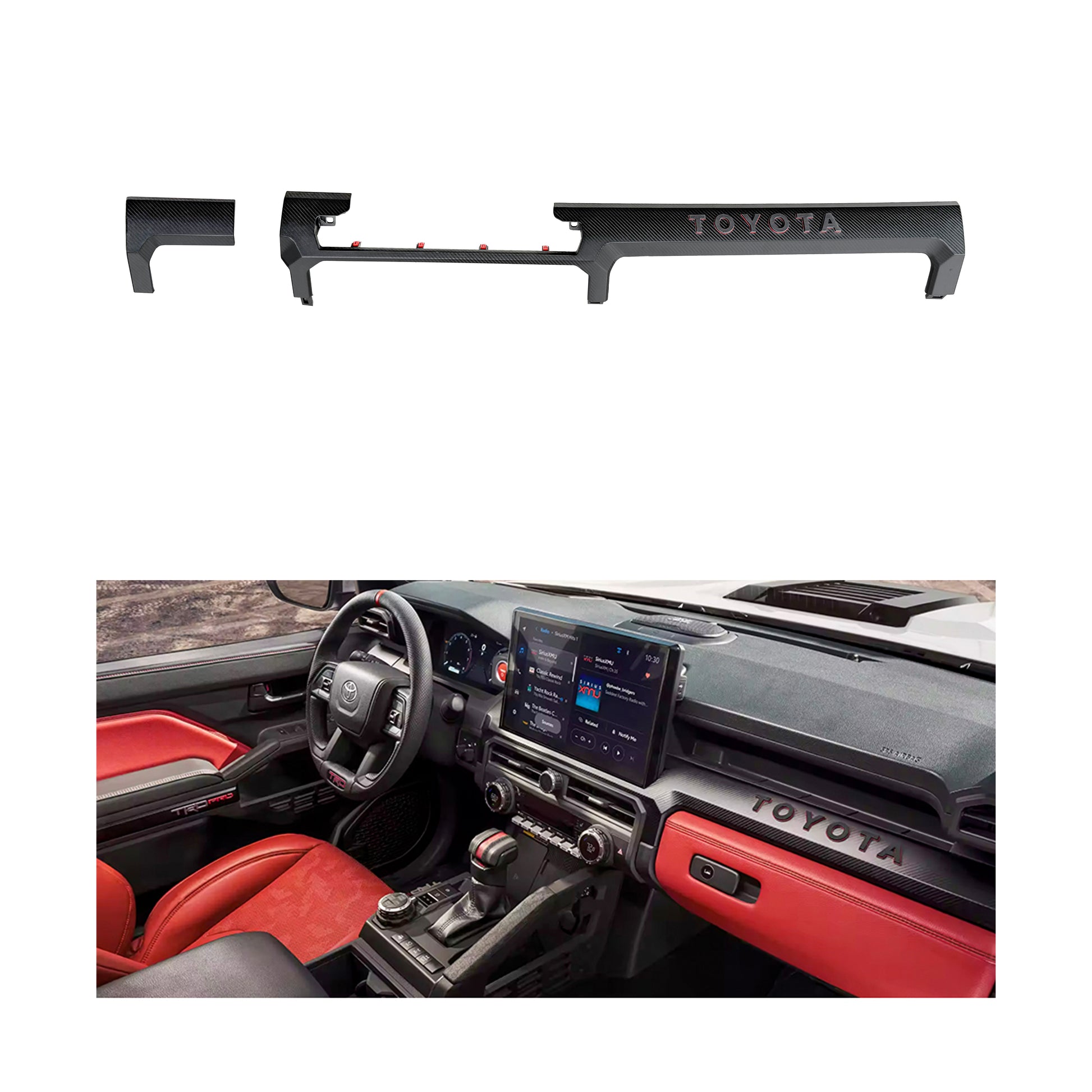 Featuring a striking carbon fiber finish and a red-accented raised TOYOTA word mark, this will make for a huge interior upgrade.
